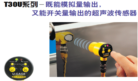 功能多样 U-GAGE T30U系列为超生传感器的多功能性设置了新标准,在同一个传感器中既包括开关量输出,又包括模拟量输出。 两种型号:NPN或PNP开关量输出,加上一个0-10V dc 或 4-20 mA模拟量输出。